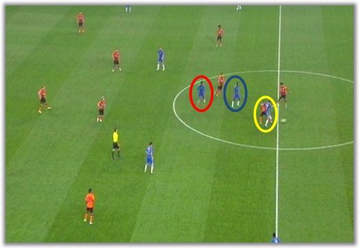 A jogada tem início na direita. Hazard (amarelo) recua para receber o passe de Terry. Tentando abrir espaço para o seu colega, Ramires (azul) avança no terreno. A bola será encaminhada para Mikel (vermelho). Note-se como os quatro jogadores do Shakhtar formam uma diagonal quase perfeita, fechando as linhas de passe.