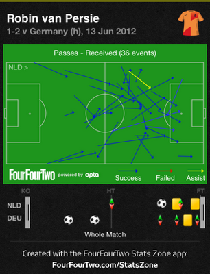 | Van Persie tende a procurar o espaço nas costas da defesa contrária. |